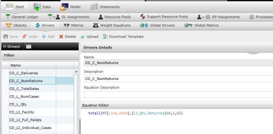 Type "(" in the Equation Editor to make a pop-up box appear. Choose from functions, cost objects/drivers/processes or process time variables to add to the equation. You can also add another Driver Equation to the equation by selecting a driver in the Drivers window, copying the equation and pasting it in the new driver's Equation Editor.