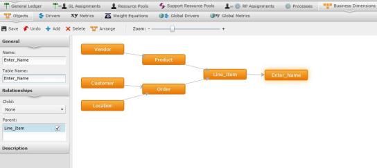 Example: The cost object "Product" is sold by the "Vender." If there was no product, what good is a vender? Because "Vender" relies on "Product" to exist, "Vender" and "Product" have a parent/child relationship. The arrows between the orange boxes indicate this relationship. "Vender" is the child of "Product," therefore, the arrow is pointing from "Vender" to "Product."